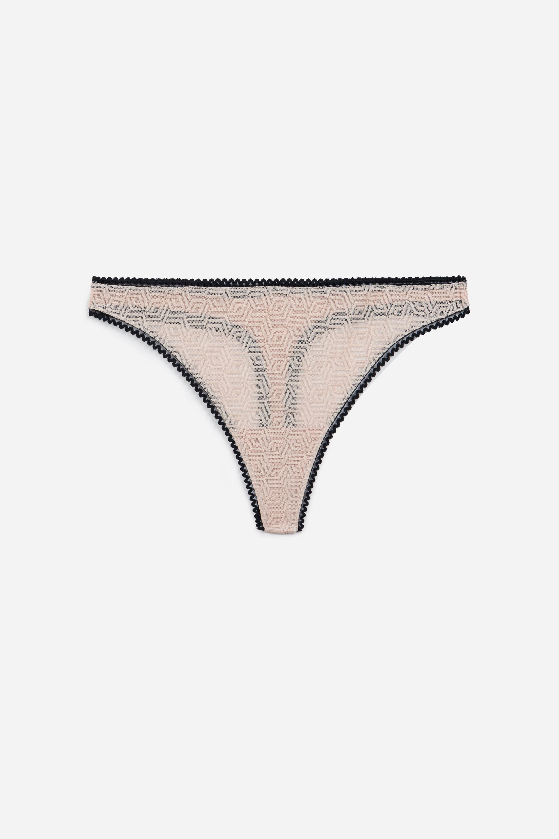 This comfortable thong silhouette features our most intriguing trim yet: The Synergy Thong offsets a modern, MC Escher-worthy jacquard mesh with a contrasting black ric rac trim that seems to float on skin.